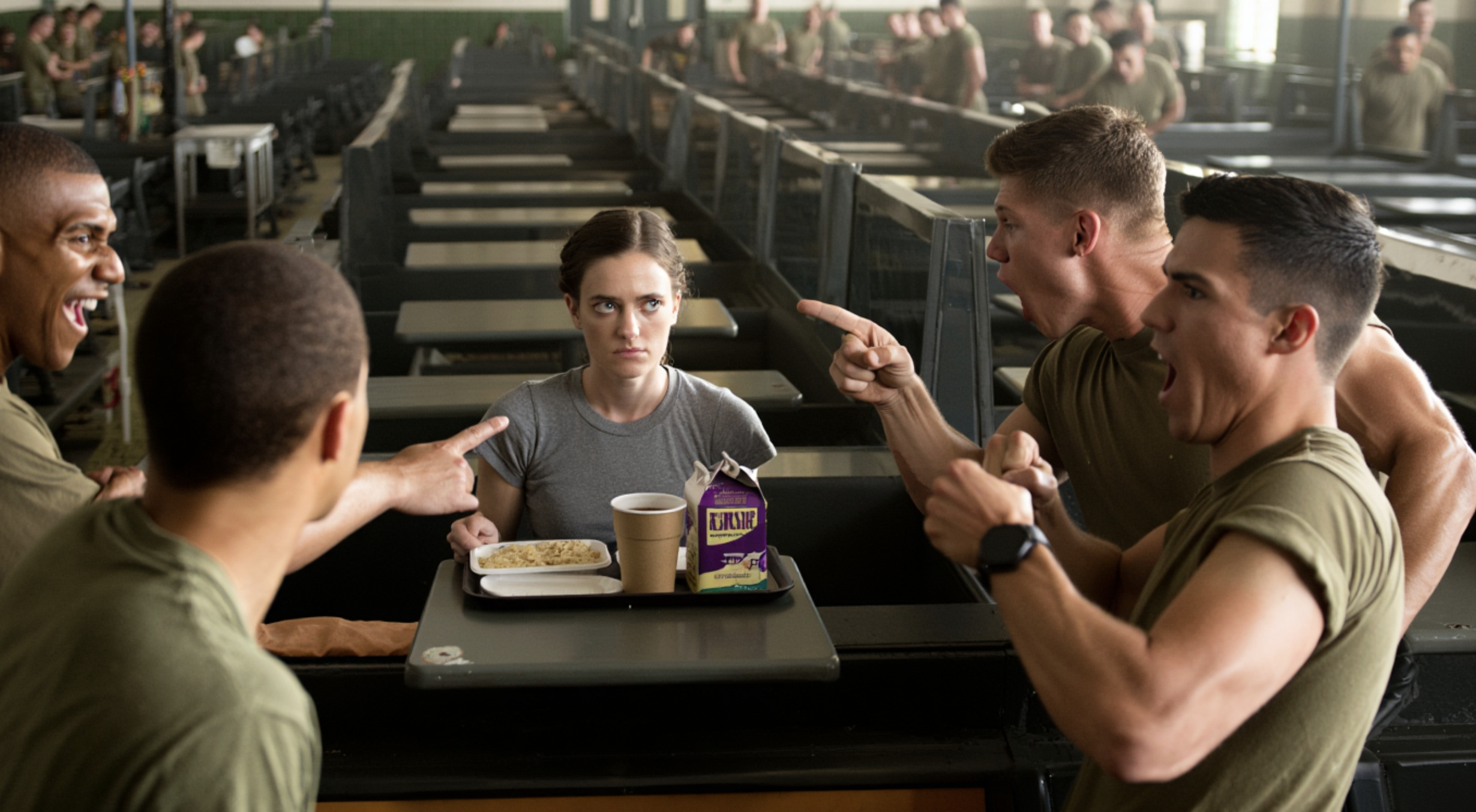 The mess hall erupted into chaos. Chairs scraped across the floor. Trays clattered to the tiles. Other recruits froze, unsure whether to intervene or just witness.