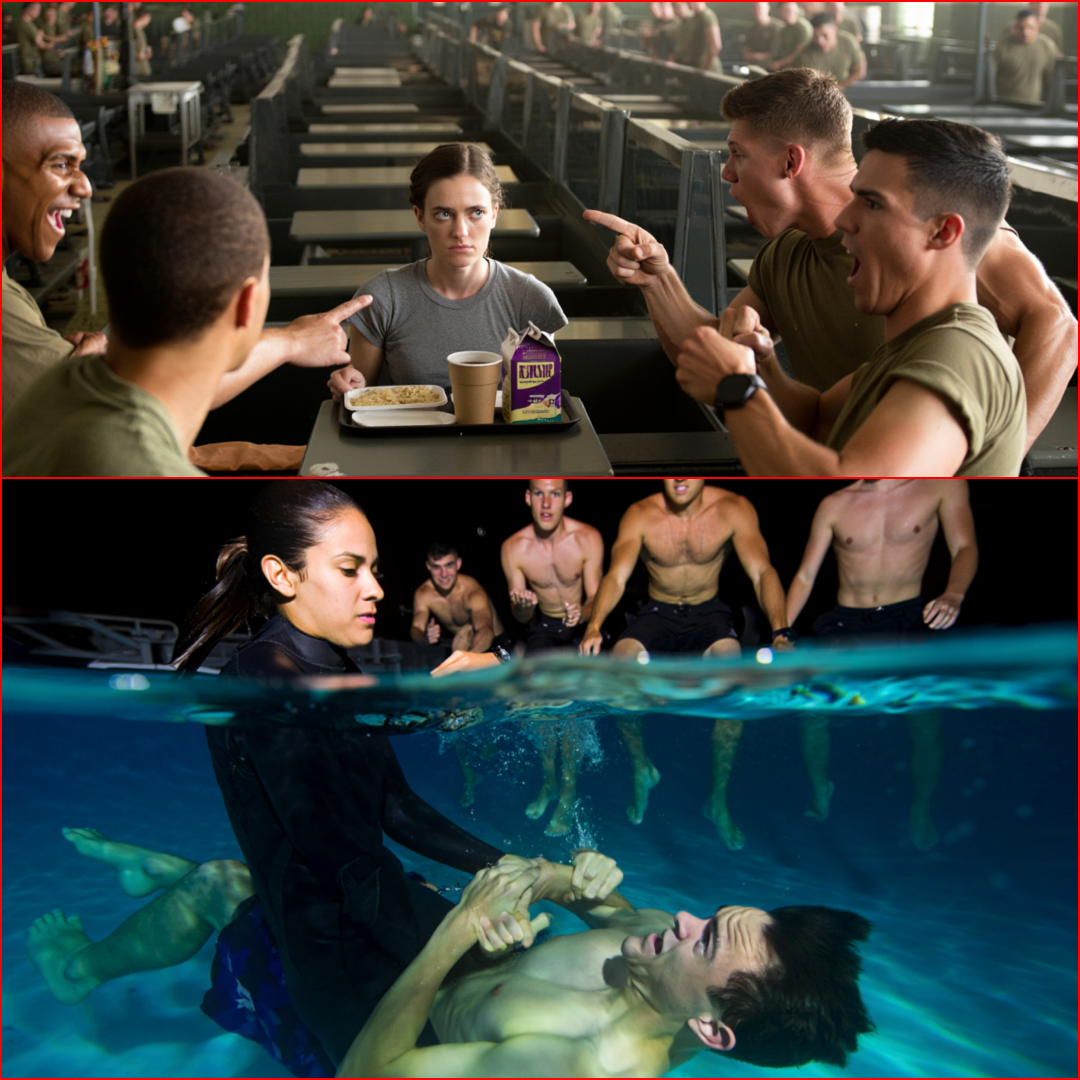 The mess hall buzzed with the usual chaos of a military training facility: trays clattering, voices overlapping in laughter and complaints, the scent of eggs and coffee thick in the air. A group of four SEAL candidates leaned against a corner of the long cafeteria table, eyes scanning the room like predators assessing prey. They were brash, confident, the kind of men who had been told they were elite before they had earned a single stripe.