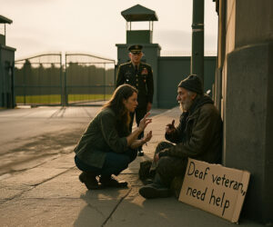The first time I saw him he was shivering outside the base gate, clutching a cardboard sign that read, “Deaf veteran, need help.” Wind scraped along the chain link and snapped at the corners of his jacket—the old army kind, thinned by decades, its color surrendered to weather and time. Soldiers streamed past him without a glance. Engines idled. A horn barked at the checkpoint, impatient and impersonal.