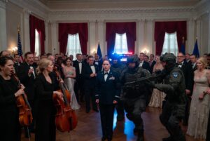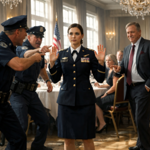 Light poured in—violent red and blue, spinning across the chandeliers and uniforms, turning the room into a jittery, fractured scene. Two Air Force security forces MPs stepped into the ballroom with weapons held low but ready, faces set in a grim professionalism that didn’t belong at a gala.