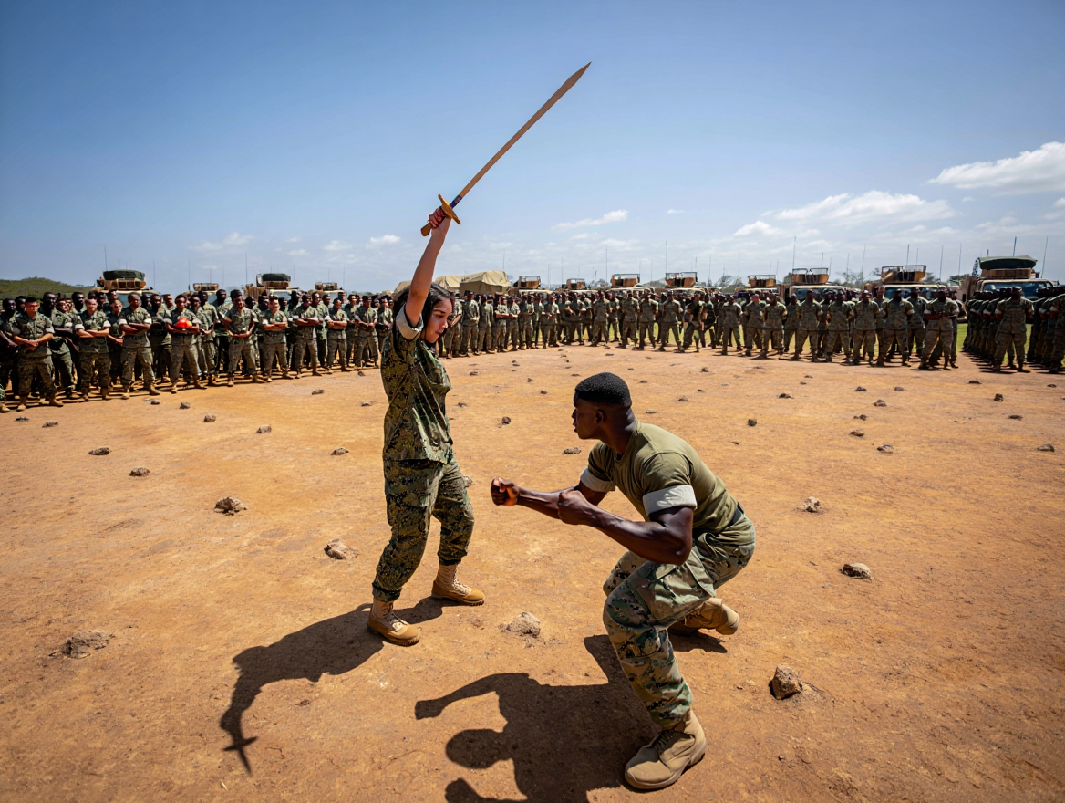 At dawn, the training field was already alive with shouts, sand kicking up under boots, and the sharp crack of instructors’ whistles. Sweat soaked Aria’s shirt before the sun even crested the treeline.