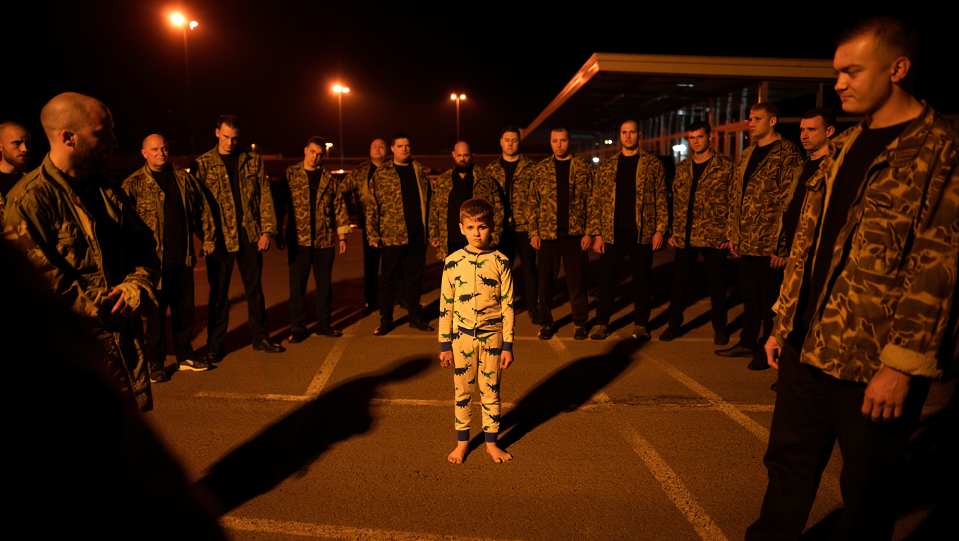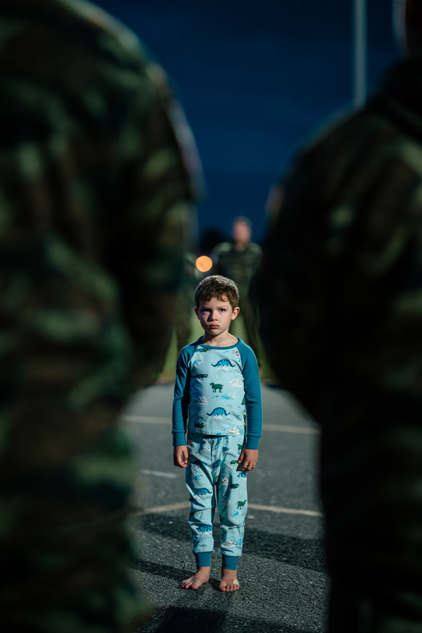 There, in the center of the lot, stood Liam—tiny in his dinosaur pajamas, barefoot despite the cold. But he wasn’t alone. Surrounding him was a circle of eighteen large men, all in worn camouflage jackets, their faces shadowed and stern. They were marching slowly around him, boots thudding in perfect rhythm against the pavement. Low voices chanted in unison: “Left… right… left… right…” It looked like some bizarre ritual, a group of grown men encircling my silent, defenseless child in the dead of night.