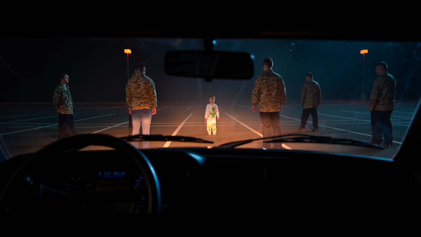 As I turned into the lot, my headlights swept across the scene, and my blood ran cold. There he was, my little boy, standing in the middle of a circle of men. Eighteen of them, all tall and imposing, wearing worn camouflage jackets that screamed “military.” They were marching slowly around him, their boots hitting the pavement in perfect sync, voices chanting low: “Left… right… left… right…”