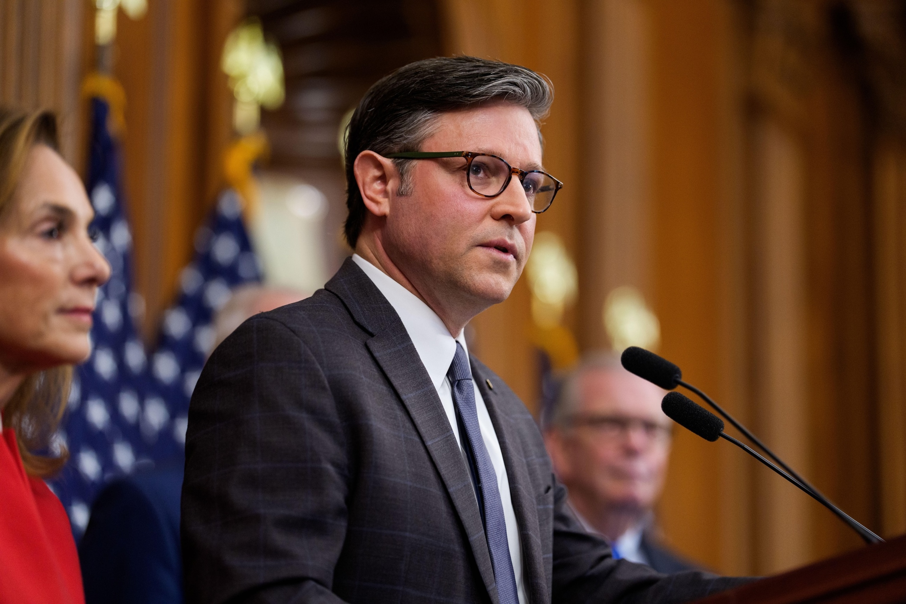 Speaker of the House Mike Johnson speaks at a press conference with other House Republicans, more than a month into the ongoing U.S. government shutdown on Capitol Hill in Washington, November 4, 2025.