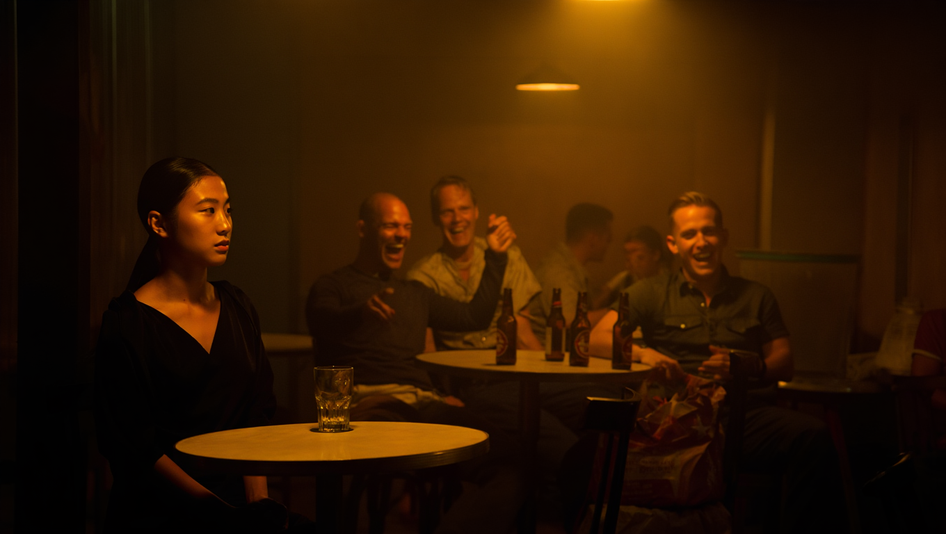 They noticed her stillness, too—the way she didn’t scroll her phone, didn’t scan the room with obvious curiosity. She existed without announcing herself, which to men already three drinks deep felt like a challenge.