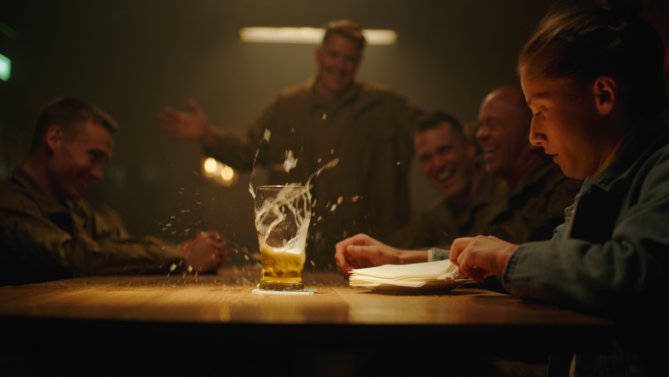 Another Marine leaned back too far, chair scraping loudly, beer sloshing forward in a dramatic spill that soaked her sleeve.
