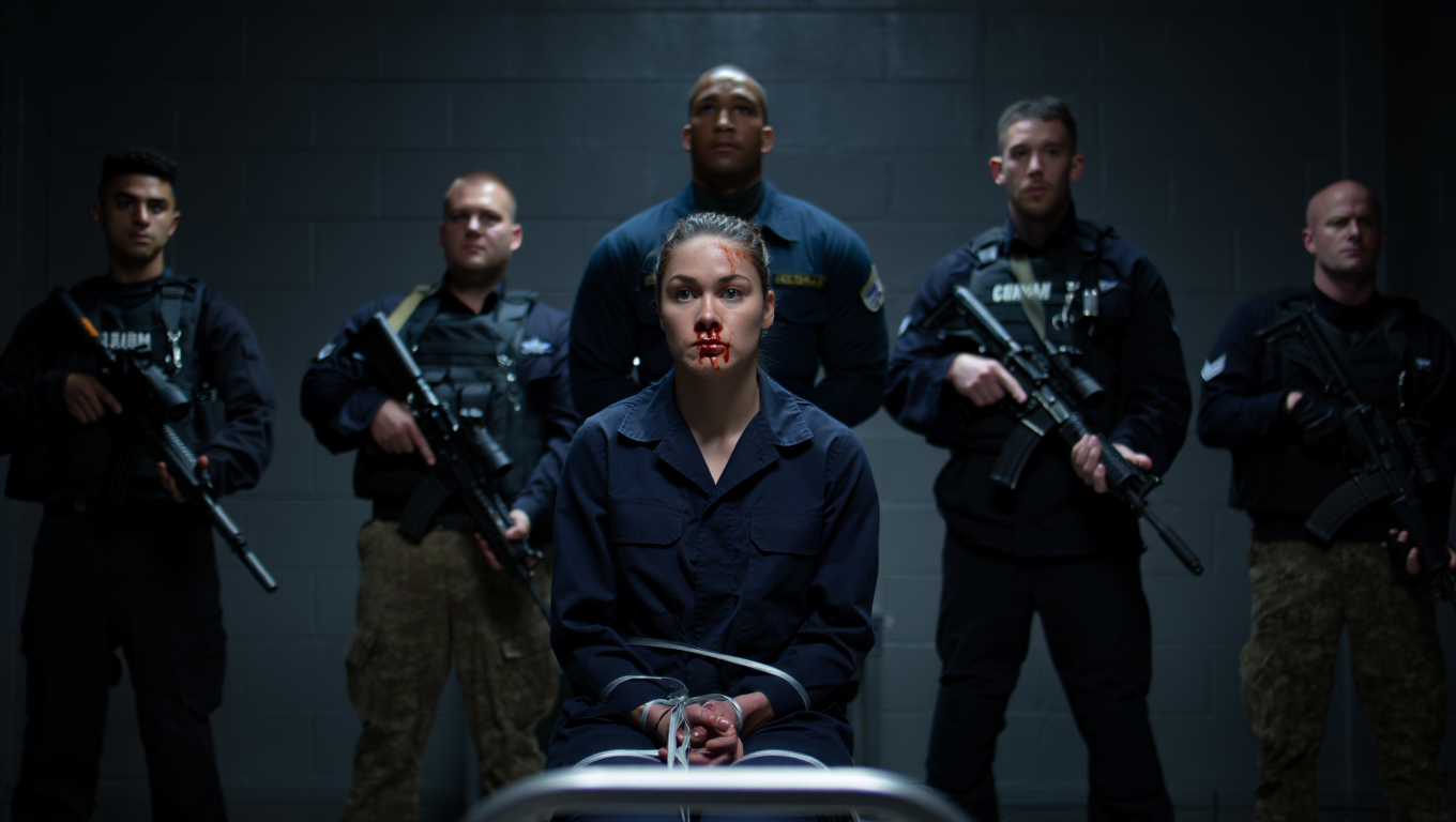 Blood dripped from Lieutenant Commander Morgan Blackwood’s split lip onto her dusty shirt, each crimson droplet marking time in the sweltering concrete room. Five armed men surrounded her, but it was the sixth who commanded her attention.