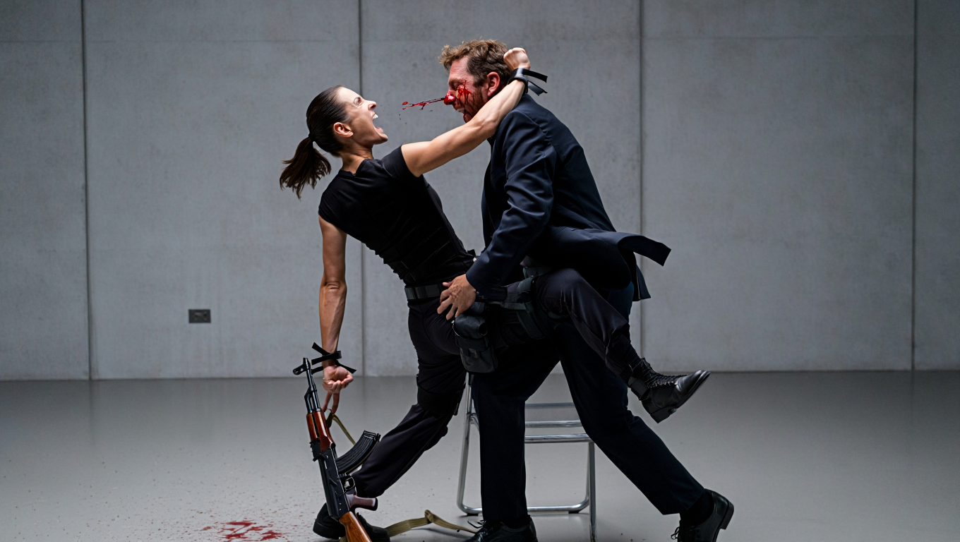 The remaining men panicked, firing wildly. She dispatched them methodically: throat slash, headshot, neck break.
