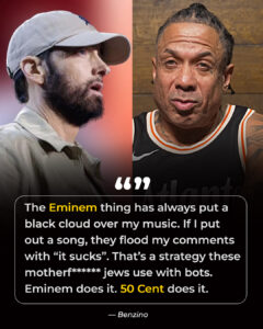 In a wild twist that’s reignited one of hip-hop’s longest-running beefs, Benzino—the former The Source magazine co-founder and sometime rapper—has gone nuclear on Eminem and 50 Cent, accusing them of deploying bots to flood his music with negative comments. The 59-year-old Boston native dropped the bombshell during a heated October 23, 2025, interview on The Art of Dialogue podcast, claiming the duo’s “digital army” is behind the “trash” labels plaguing his latest tracks. “They got bots leaving 0/10 reviews on my Spotify—it’s coordinated hate,” Benzino fumed, waving a screenshot of scathing comments on his single “Woke Woke Woke.” Fans are cackling, but Benzino’s dead serious: “This ain’t jealousy; it’s jealousy with tech.”