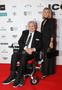 The event, held at Caudwell Tower – the billionaire’s opulent Mayfair residence – was a glittering spectacle attended by 300 guests, including David Haye and his partner Sian Osborne, who turned heads in a plunging pink dress and leather jacket. Holmes, using his walker for support, arrived in a sharp navy suit, his arm linked with Alexander’s as they navigated the red carpet. Alexander, elegant in a ruched purple-brown gown paired with a faux-fur jacket, gold heels, and a black leather clutch, held him close, her presence a steady anchor. “Eamonn looked truly happy – loved up and at ease,” an attendee told The Mirror. The couple shared quiet laughs and posed for photos, with Holmes whispering something that made Alexander beam.