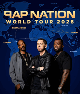 Eminem, Snoop Dogg, and 50 Cent—the hip-hop trinity whose bars, beats, and bravado have built empires and broken boundaries—have detonated a 2026 world tour announcement that’s already shattering ticket sales records, a 30-stop global juggernaut spanning North America, Europe, Asia, and South America that’s being dubbed “Up in Smoke 2.0” with a teased live-only unreleased track as their “first new heat together.” Unveiled on September 30, 2025, via a joint X Spaces event that peaked at 2.5 million listeners, the tour kicks off June 15 at London’s Wembley Stadium (90,000 capacity, £150 tickets) and thunders through Paris’s Stade de France (July 5), Tokyo Dome (August 12), Rio’s Maracanã (September 20), and Sydney’s Accor Stadium (October 18), promising a £100M+ haul that eclipses Jay-Z’s 2009 Blueprint 3 trek (£80M).