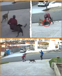 One dog nipped at her while trying to grab her pet. The second dog then joins in, with both animals lunging and snarling.