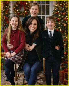 As celebrations begin across the UK, the Prince and Princess of Wales have shared their annual Christmas card, featuring a touching family portrait that has delighted royal watchers. Released on December 24, 2025, the image captures Prince William, Catherine, and their three children—Prince George, 12, Princess Charlotte, 10, and Prince Louis, 7—in a relaxed garden setting at Anmer Hall, Norfolk. The family, dressed in coordinated neutrals, smiles warmly, with Louis playfully peeking from behind his father. The card’s message reads: “Wishing you a very Happy Christmas and New Year,” signed by William and Catherine.