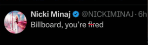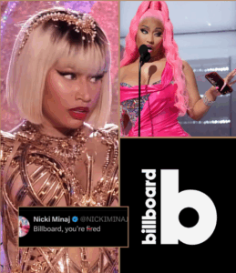 Nicki Minaj has lashed out at Billboard, calling them “f-ired” after her albums failed to re-enter the chart despite heavy mass buying on iTunes from September 30 to October 3, 2025, as reported by Billboard on October 4, 2025. The Pink Friday 2 (2023) briefly climbed to No. 50 but plummeted 85 spots to #113, while The Pinkprint (2014) vanished from the top 200, and Queen (2018) and Pink Friday (2010) didn’t crack the top 150. The surge, fueled by Minaj’s feud with Cardi B over album sales (Cardi’s Am I the Drama? debuted at No. 1 with 200k units on October 4, 2025), failed to sustain, with fans blaming “feud hype” for the brief bump.