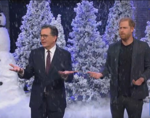 The pair then transitioned to a wintry scene as they briefly reenacted the biggest cliches of Hallmark holiday cinema, with Colbert and Prince Harry embracing at the end.