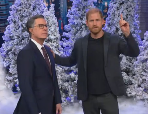 Colbert was discussing the trend of holiday movies with jokey titles like The Gingerbread Prince Saves Christmas in a Basket when Prince Harry popped up on the set
