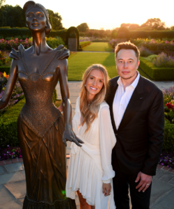 She was sculpted not from classic Italian marble, but from a shimmering titanium-aluminum alloy—the very material Musk himself designed for the Starship hull. The statue’s surface reflected the Texas sun, coolly yet magically, making Elara appear encased in a metallic aura. Standing nearly five meters tall, the sculpture depicted Elara in a poised stance, her left hand resting gently on her hip, her long hair swept back as if by a Martian dust gust, her gaze fixed on the horizon where the SpaceX launch pads towered.