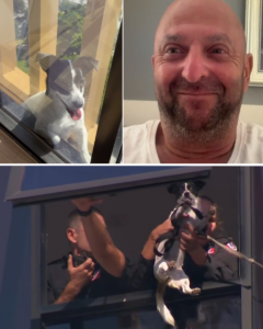 Firefighters were called in, launching a delicate operation to reach the stranded dog and bring her back inside.