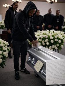 Witnesses say he sat quietly through the final eulogies, occasionally wiping at his eyes, his body hunched forward like the grief was too heavy to carry upright.