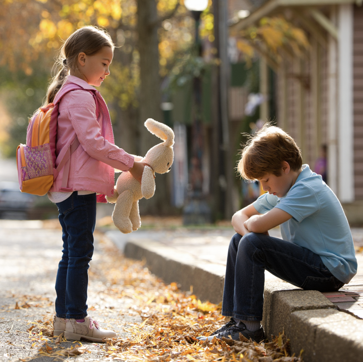 As Lila turned the corner by the old gas station, she saw him — a boy, maybe her age, sitting on the curb with his knees pulled tight to his chest. His clothes were dirty, his face pale, his eyes red from crying. Beside him lay a folded flag, wrapped carefully in plastic.