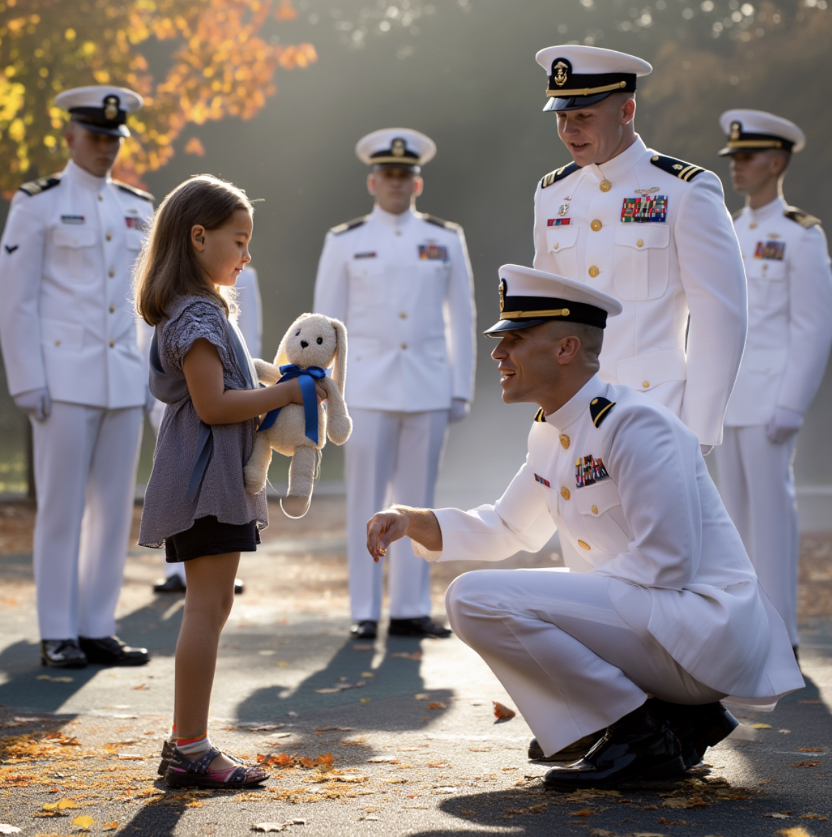 From it stepped six men in dress uniforms — medals glinting under the sun, their expressions solemn. At their front was Commander Holt, tall and weathered, carrying something wrapped carefully in his gloved hands.