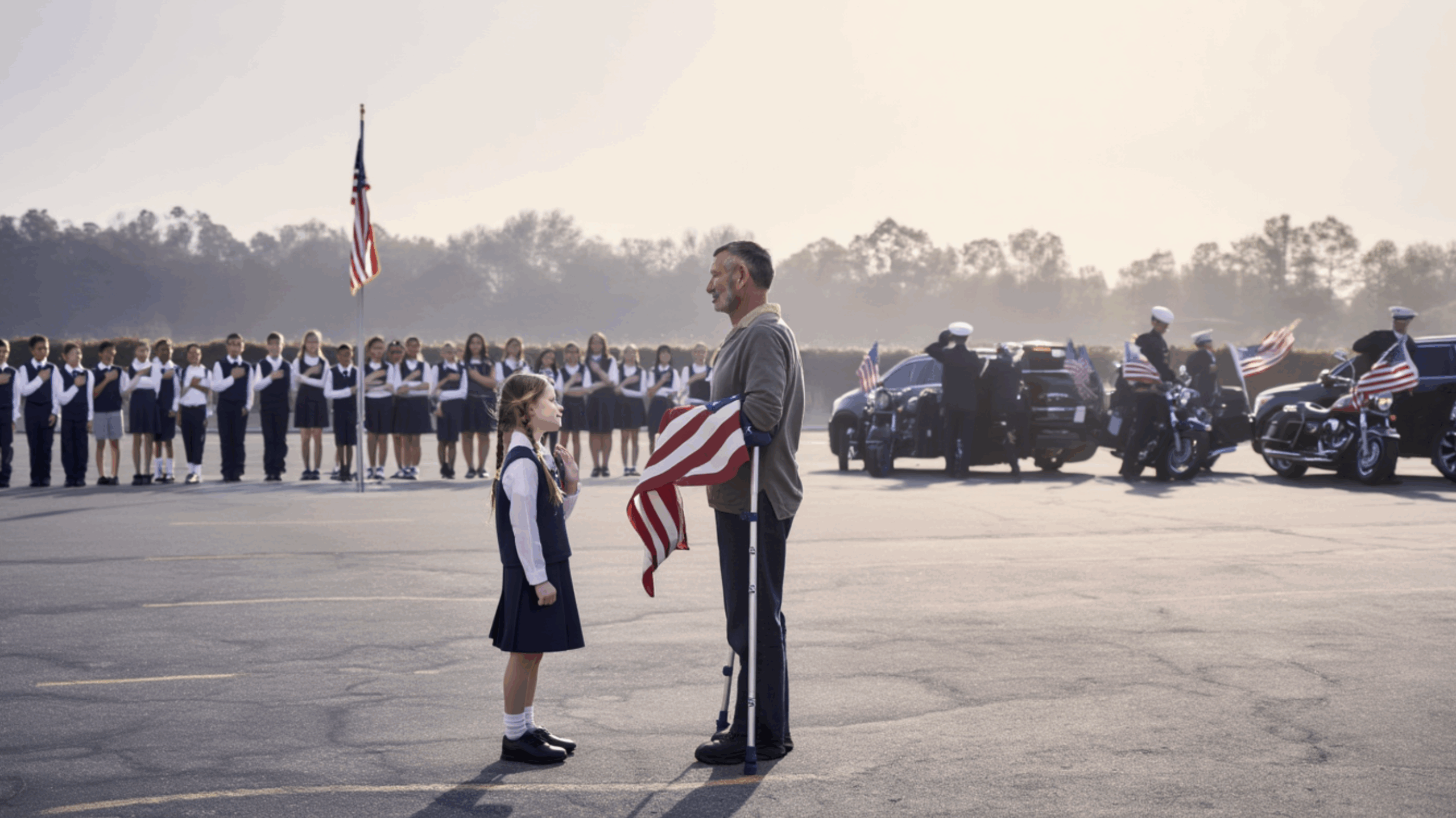 When the engines fell silent, the entire schoolyard fell into an eerie quiet. Dozens of Navy SEALs in full dress blues stepped out, their medals gleaming in the morning sun. Leading them was the same wounded veteran from the airport — walking slowly on crutches, carrying a neatly folded American flag.