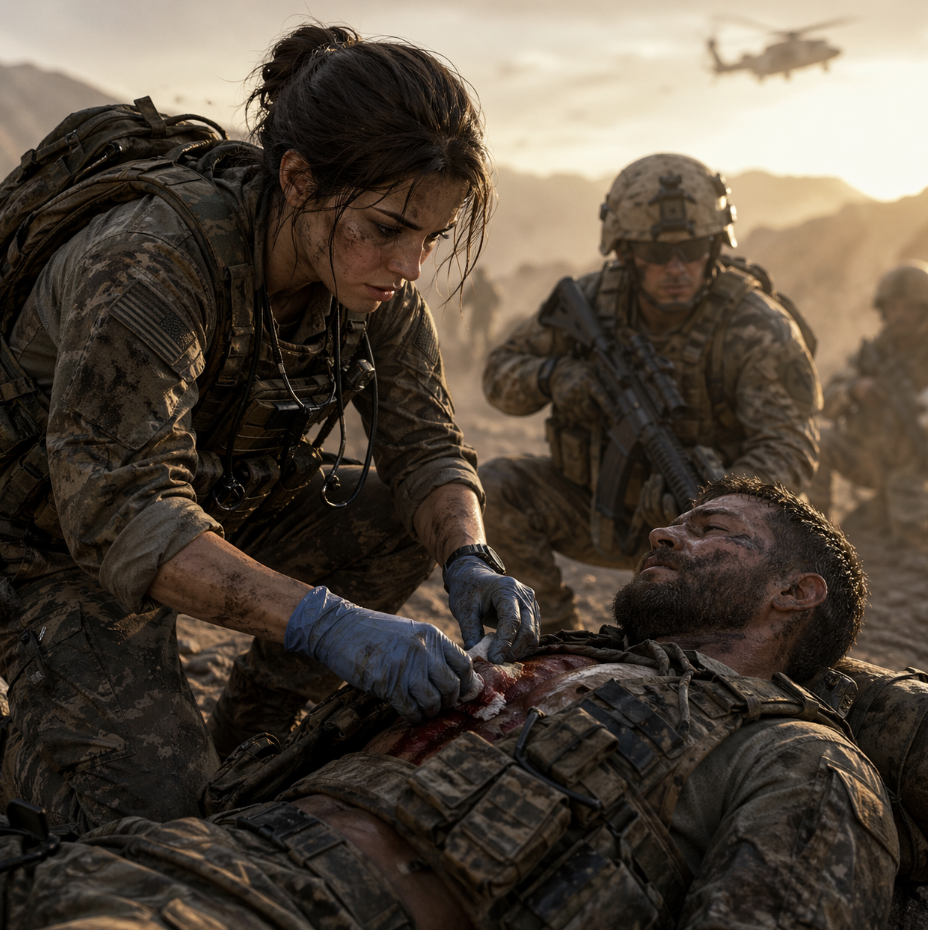 She stepped off the Chinook into a blur of dust and rotor wash, medical pack strapped tight against her back, kit bag knocking her knee with each step. The air smelled like diesel, hot metal, and the thin, sharp scent of a place that didn’t want you there. She walked with her head level, eyes forward, the same way she’d walked through hospital corridors back home—only here, the corridors were gravel and Hesco barriers, and the people watching her had rifles across their chests instead of clipboards in their hands.