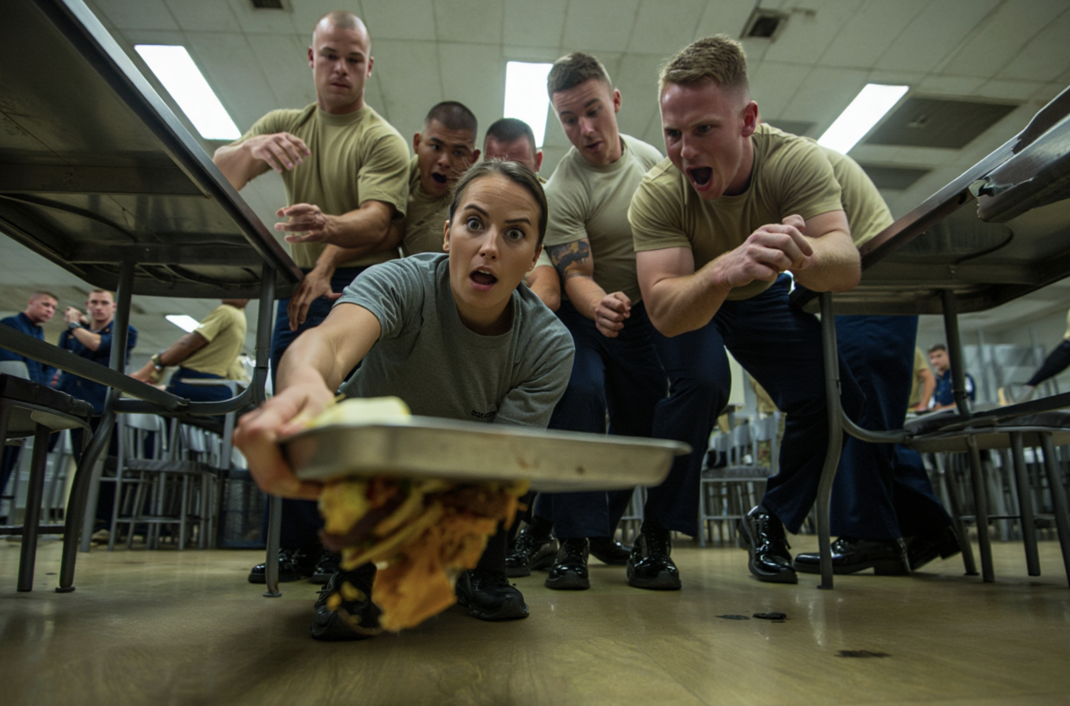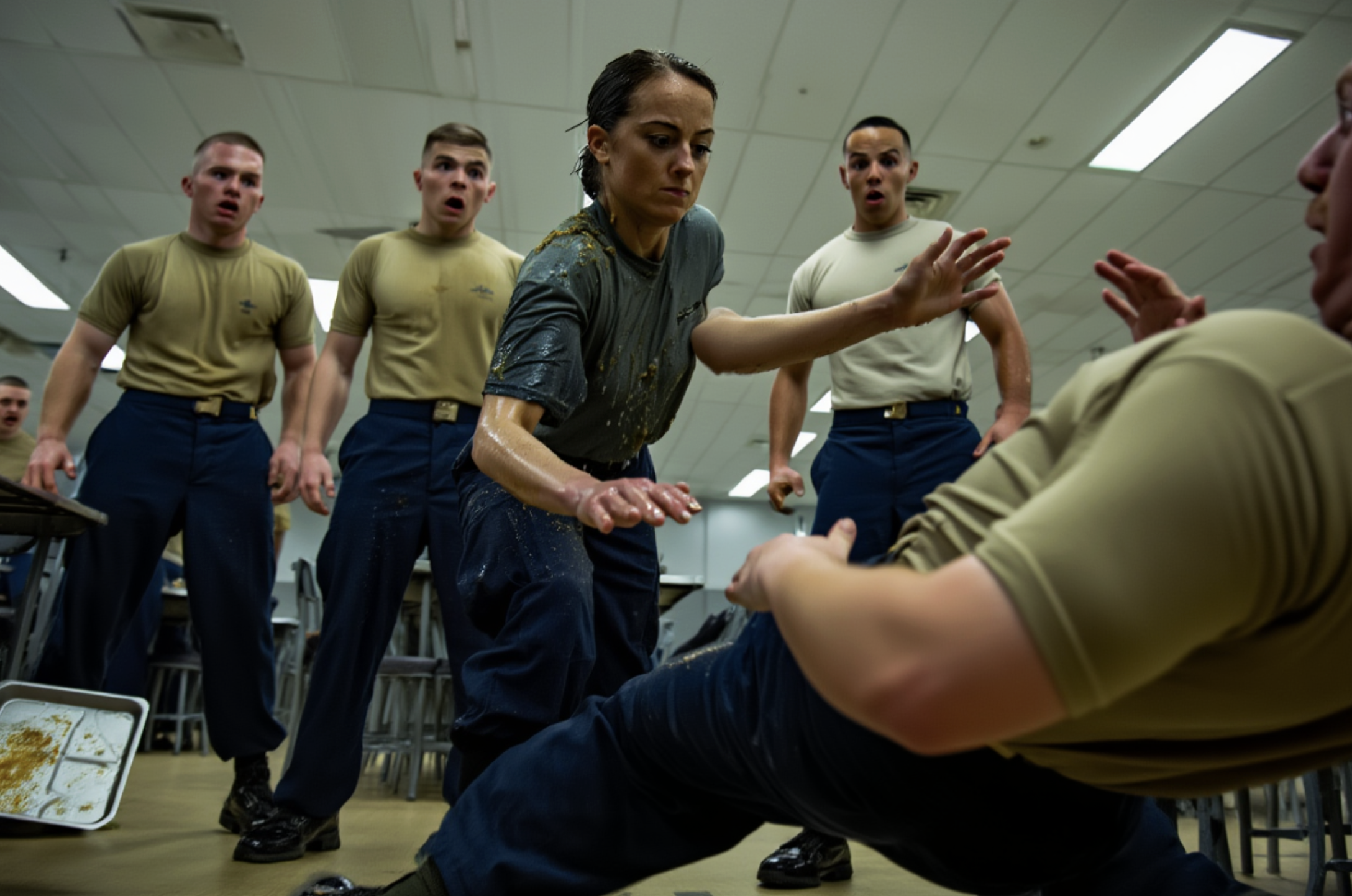The mess hall at Coronado roared with the usual midday chaos—metal trays clattering, boots thudding across tile, recruits shouting over each other in voices so loud it bordered on insecurity. Grease-scented air hung thick, vibrating with the restless energy of men who hadn’t yet learned the difference between confidence and noise.