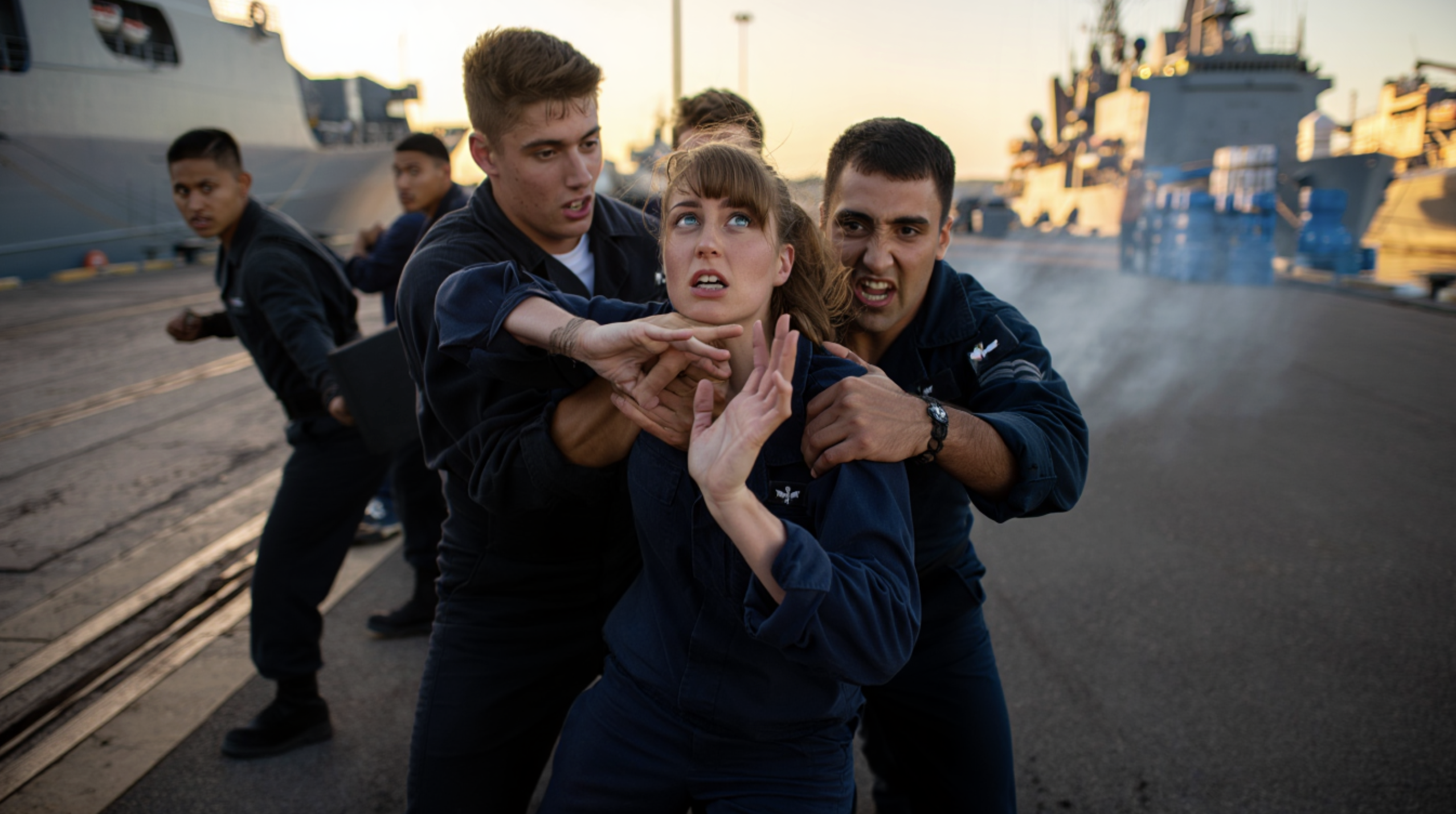 The words cut through the rumble of the USS Vigilant’s engines like a knife. Laughter erupted from the sailors, rough and unrestrained, echoing off the steel walls of the docking bay. A few crates thudded onto the deck with a metallic clang, but no sound could drown out their mocking voices.