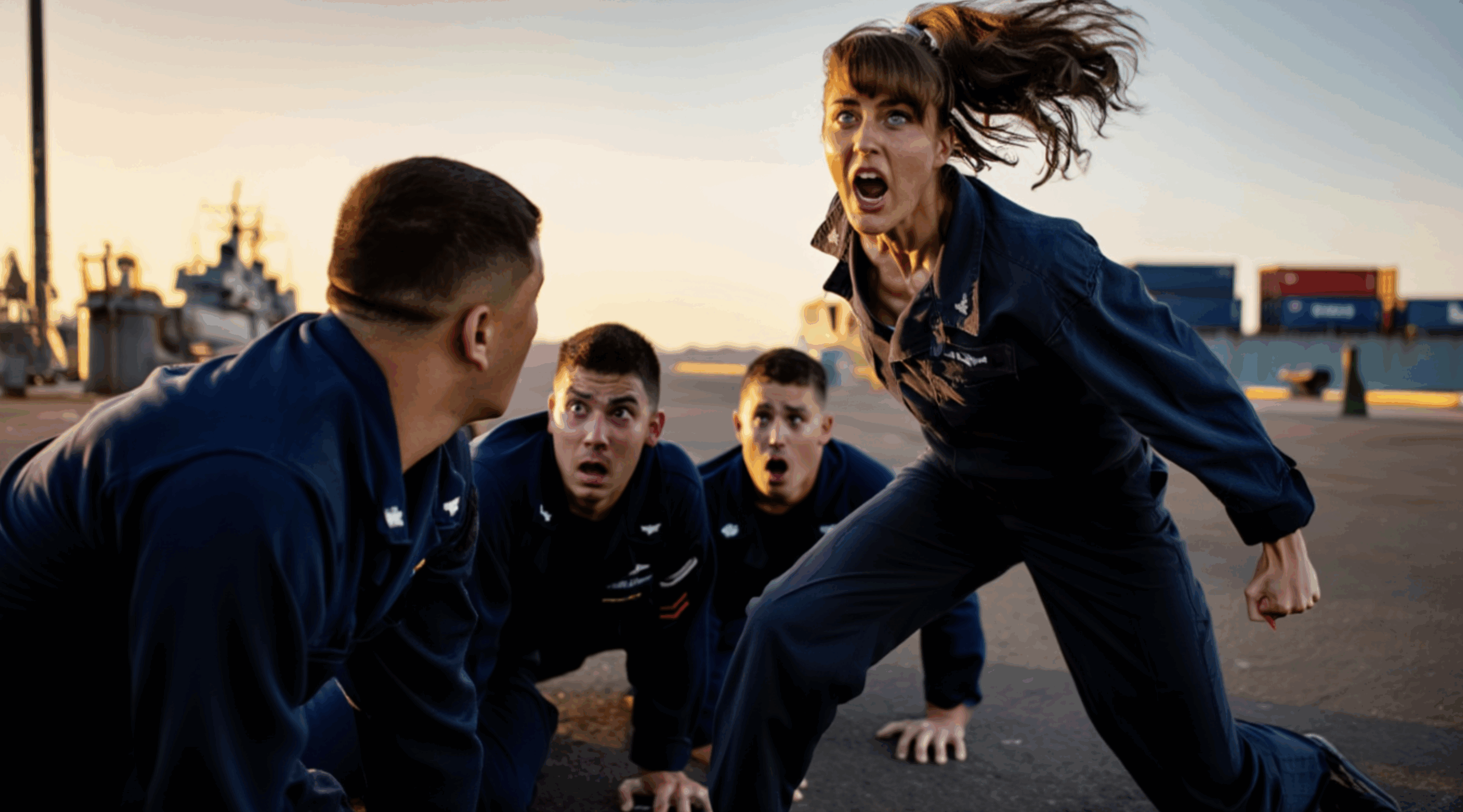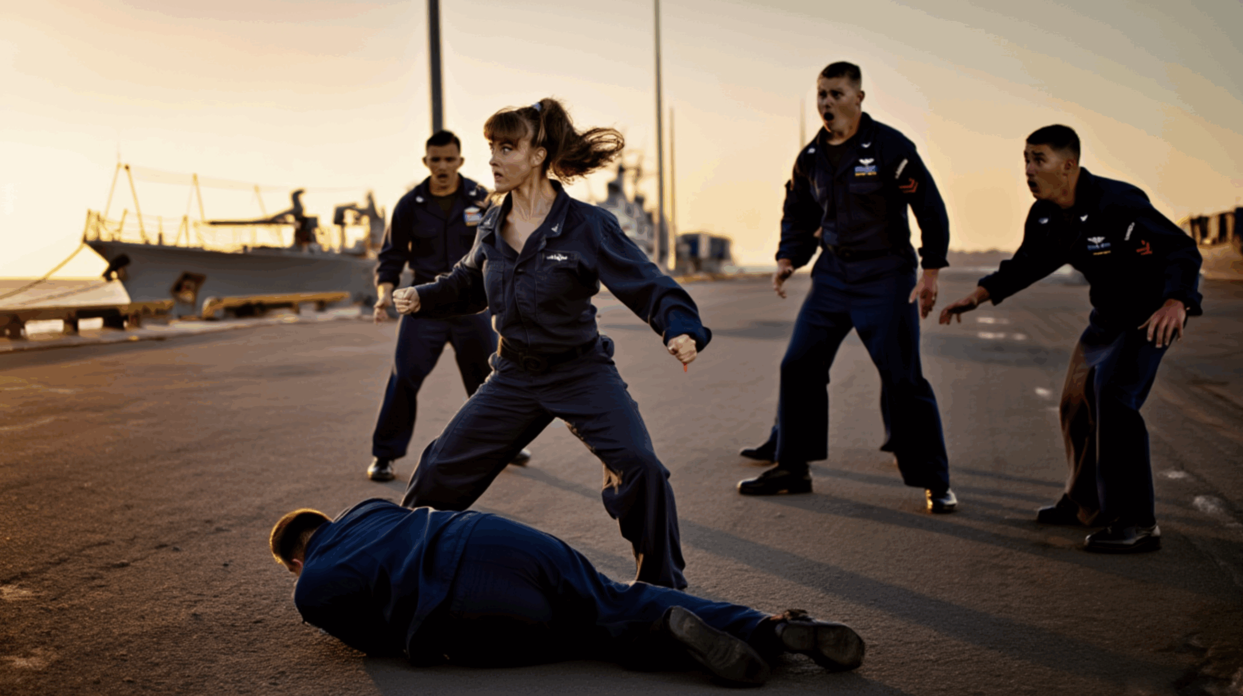 Petty Officer Ava Blake remained still, her soft frame dwarfed by the towering men around her. Her uniform was clean, unadorned — no medals, no flashy insignia. To the untrained eye, she was just another junior sailor, another newcomer who would soon learn her place. She folded her hands neatly behind her back and lowered her eyes, her face calm, almost serene, as if she were trying to disappear into the chaos around her.