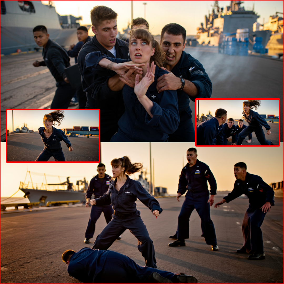 It was so fast, so fluid that the eye could hardly follow. Her hands swept from behind her back, one grabbing the man’s arm, twisting it in a motion that was precise and clinical. The other sailor lunged instinctively, but Ava ducked, pivoting on her heel with the grace of a dancer, landing behind him. A rapid succession of movements — a sweep, a push, and a twist — sent all three men sprawling to the deck, groaning and scrambling to recover.
