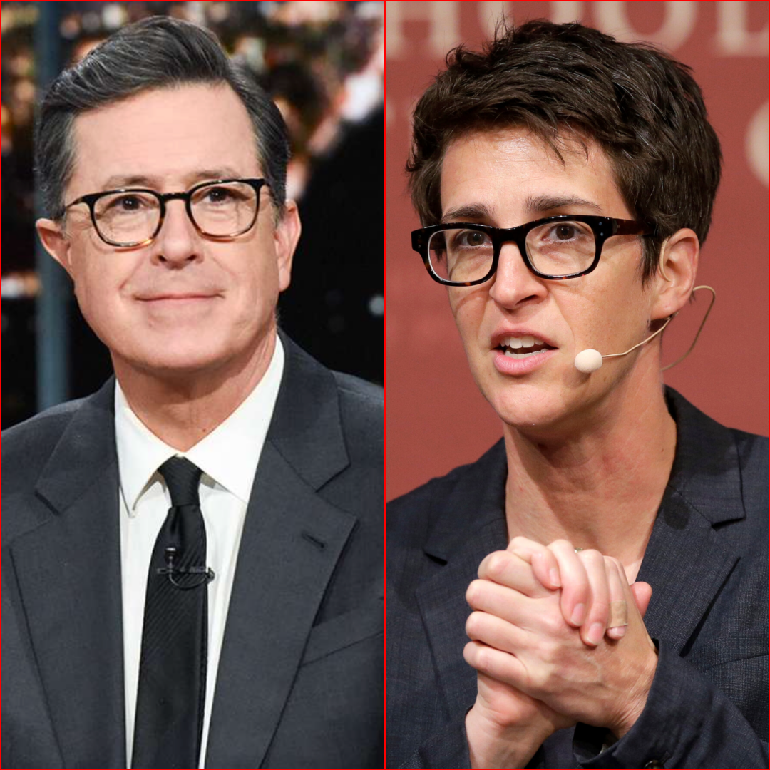 Maddow, 52, is seen toasting Colbert on his show last week, in honor of MSNBC’s rebrand to MS Now