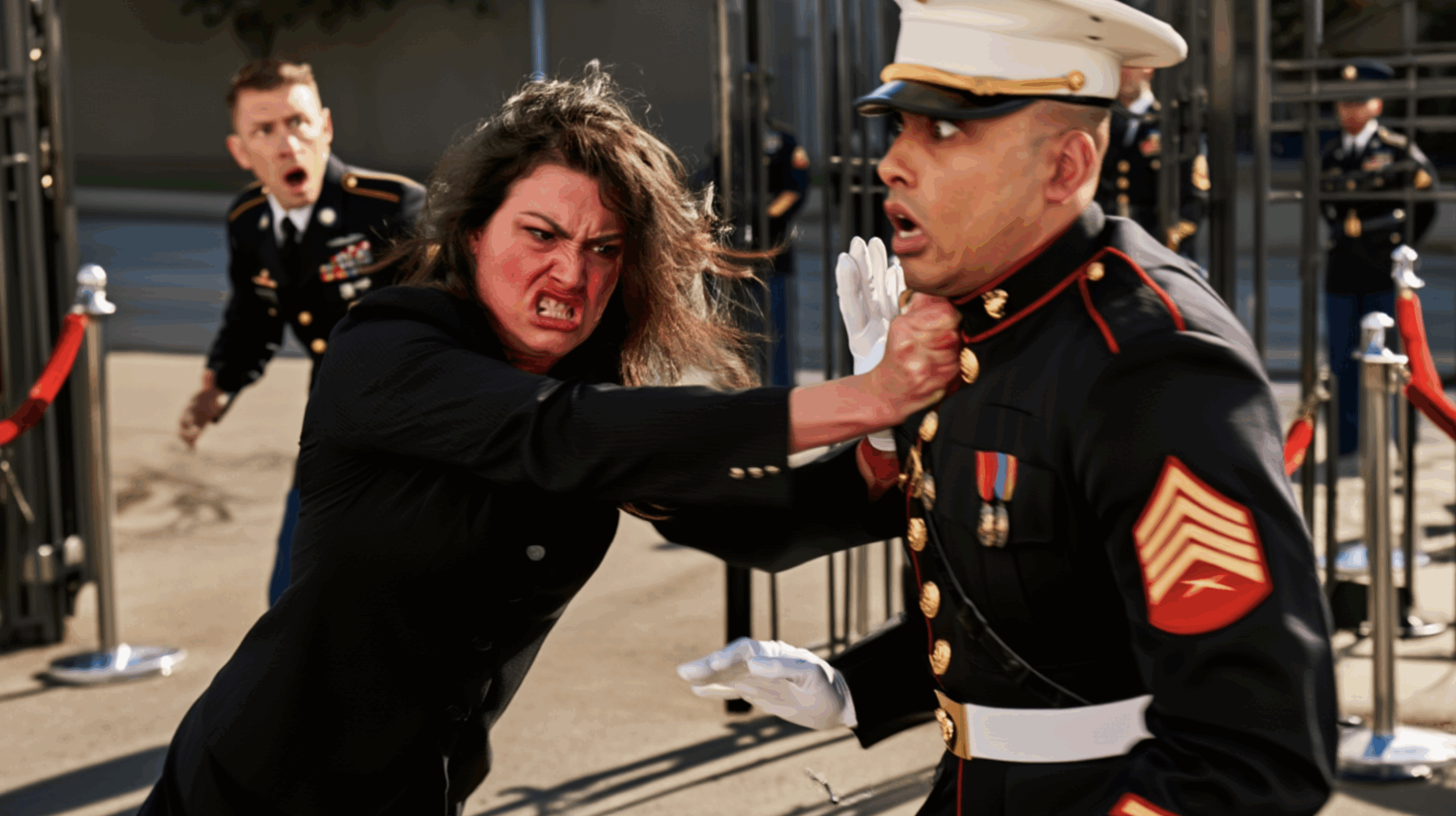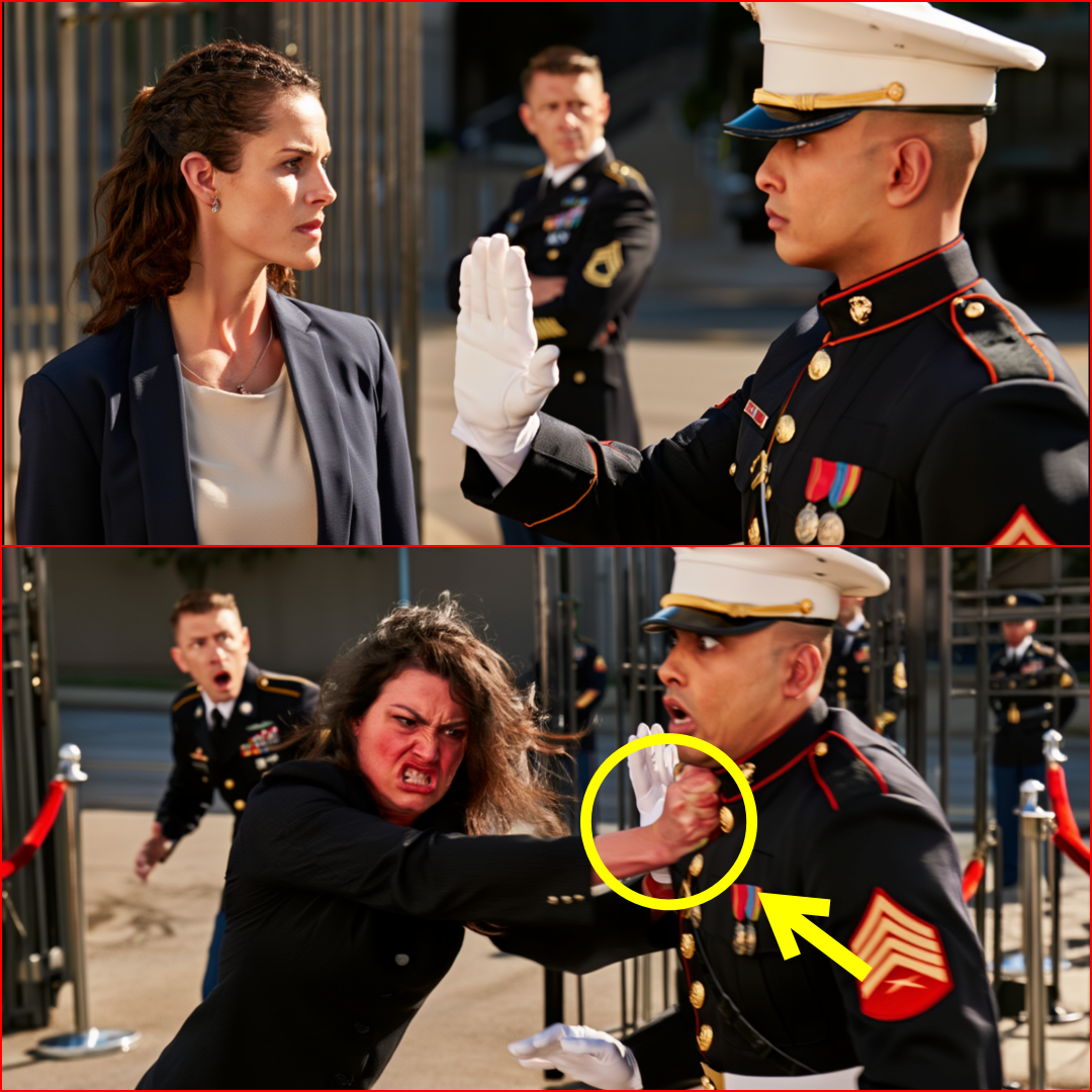 The voice was young—sharp, practiced, and carrying the kind of authority that only came with a freshly pressed uniform and a clipboard clutched too tightly in one hand. The Marine lance corporal at the edge of the roped-off VIP section held up a polite but immovable hand, palm facing forward like a small, human barricade.
