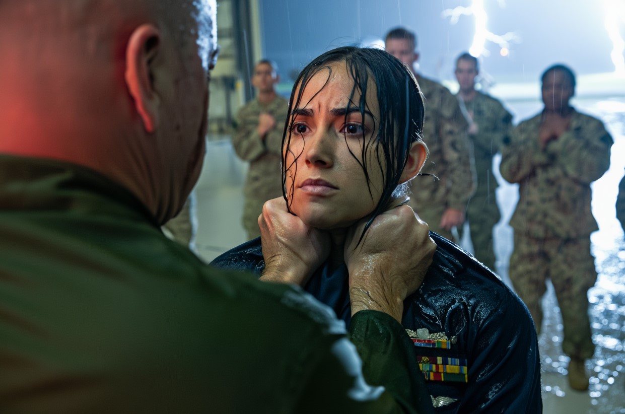 Elise Rowan was escorted into a stark, fluorescent-lit interrogation room. The chill of the concrete walls bit through her soaked uniform, and the metallic scent of the room reminded her of every austere training facility she had ever endured. There were no windows, no distractions, only a long table, several chairs, and the piercing glare of officers whose reputations for ruthlessness preceded them. The storm outside continued to pound the base, yet inside, a different storm was brewing—one of suspicion, accusation, and unspoken threats.