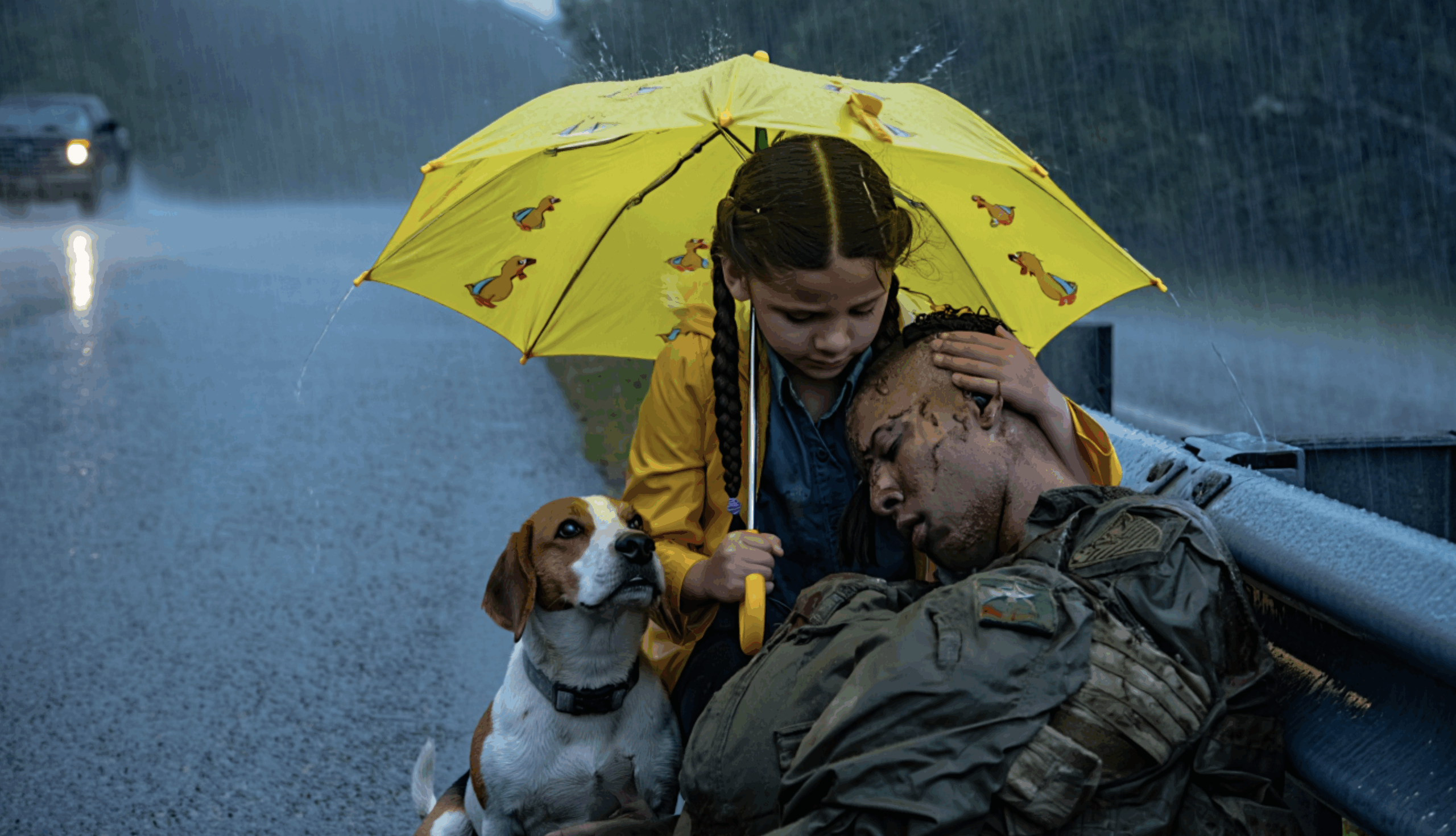 She opened her tiny umbrella — bright yellow, dotted with cartoon ducks — and lifted it over him. Rain hammered around them, soaking her shoes and backpack, but she stood her ground. Scout curled around her ankles, whining softly, as if he knew what was happening.