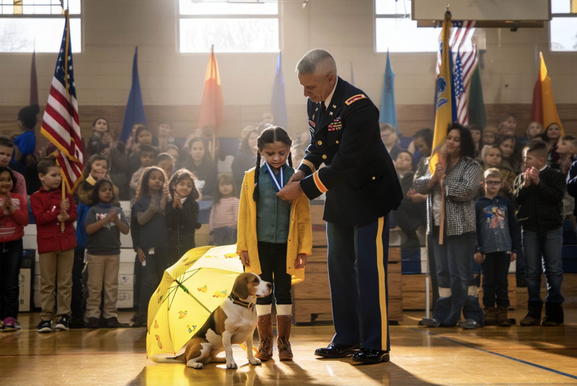 A week later, Lincoln Elementary hosted a special assembly. The gymnasium was packed — parents, students, teachers, and reporters. Emily sat in the front row, Scout in her lap, fidgeting nervously.