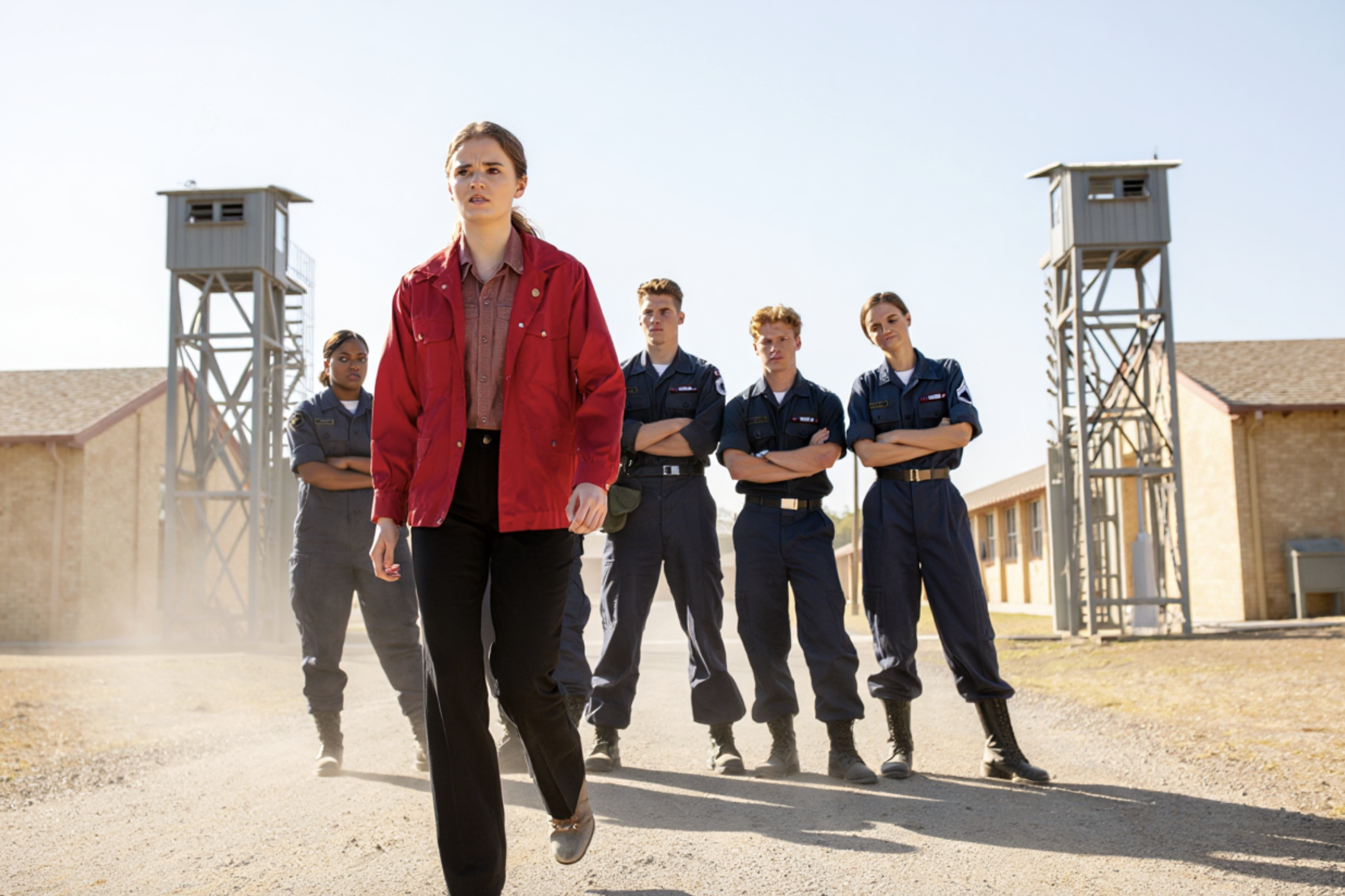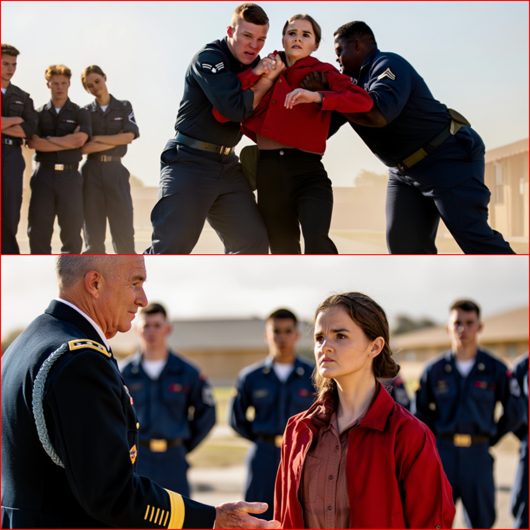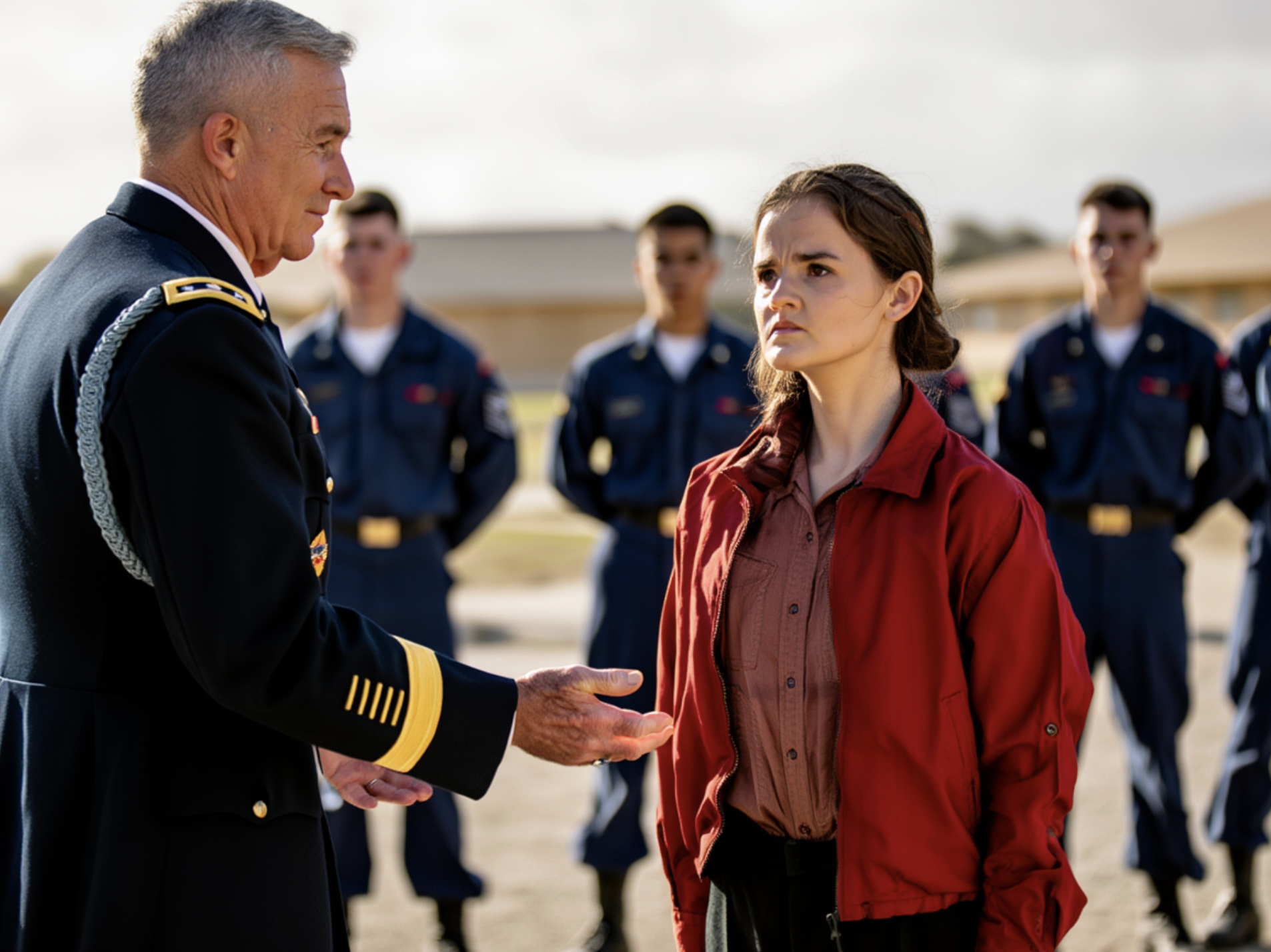He stared at her jacket again — the red so vivid it almost looked like blood under the sunlight. No rank patches. No insignia. Just red.