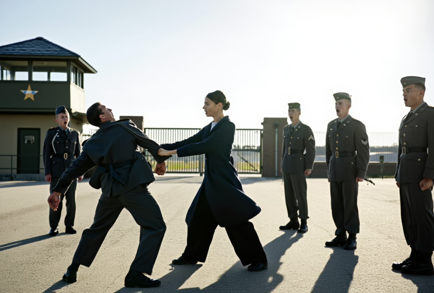 Commander Vera Ashford stood just inside the doorway, framed by the flickering fluorescent bulb overhead. Thirty-four years old. Dust and sweat clung to her uniform, but she wore it like armor, not clothing. She didn’t posture. She didn’t glare. She simply stood — balanced, quiet, steady — like a blade resting in its sheath.